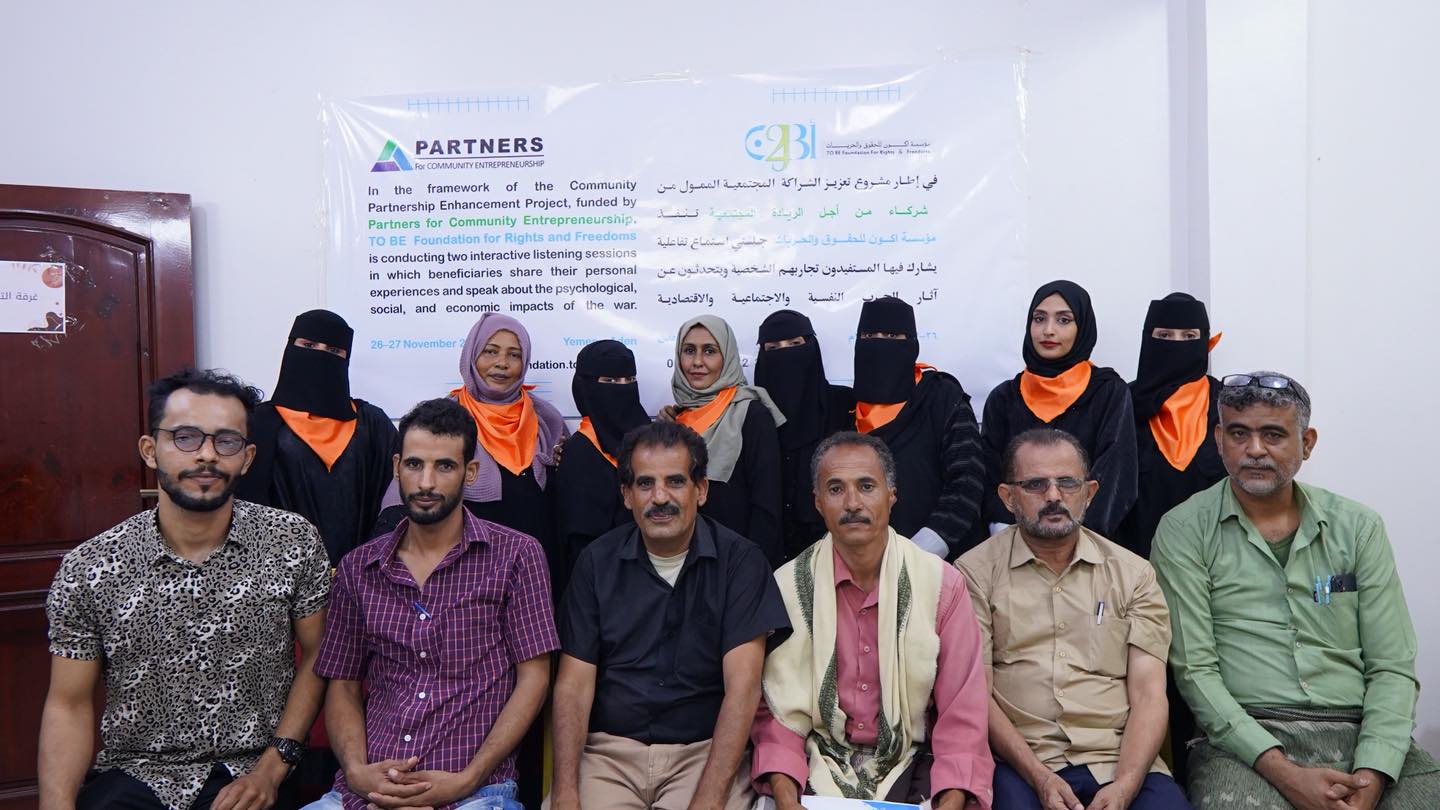 عقدت مؤسسة «أكون للحقوق والحريات» في محافظة عدن جلستي استماع تفاعليتين يومي 26 و27 نوفمبر 2025، بمشاركة عدد من المستفيدين من الناجين من الحرب، وذلك ضمن أنشطة المشروع المموّل من منظمة «شركاء من أجل الريادة المجتمعية». وهدفت الجلستان إلى توفير مساحة آمنة للمشاركين لمشاركة تجاربهم الشخصية، وتسليط الضوء على الآثار النفسية والاجتماعية والاقتصادية التي خلّفتها الحرب، إلى جانب مناقشة التحديات التي يواجهونها في حياتهم اليومية. كما جرى خلال الجلستين استخلاص أبرز القضايا والتوصيات التي طرحها المشاركون.